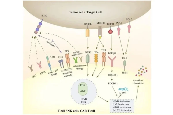 B7-H3 pertenece a la familia de puntos de control inmunitario y se expresa altamente en múltiples tumores sólidos, mientras que su expresión en tejidos normales es baja, lo que la convierte en una diana importante con propiedades tanto inmunológicas como de direccionamiento.