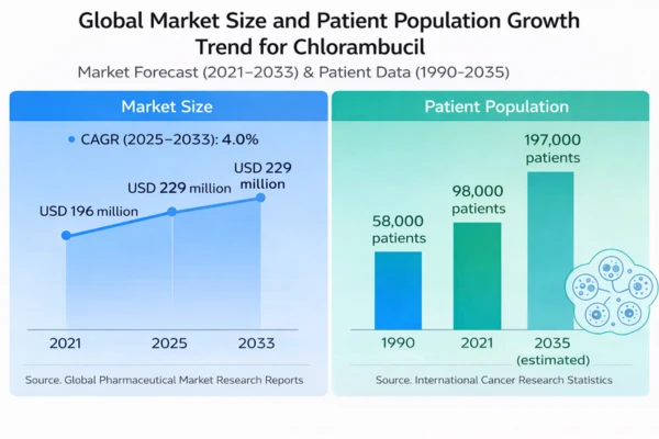 Los datos de mercado muestran una expansión constante del clorambucilo a nivel global. En 2021, el tamaño del mercado fue de aproximadamente 196 millones de dólares, y se espera que alcance 229 millones de dólares en 2025 y supere los 313 millones de dólares en 2033, con una CAGR del 4,0 % entre 2025 y 2033.