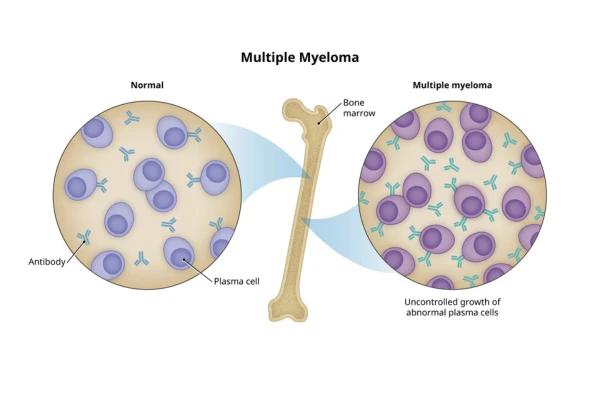 Cuando estas células se vuelven cancerosas, se multiplican de forma descontrolada, invaden la médula ósea y producen proteínas anormales que dañan órganos como los huesos, los riñones y el sistema inmunológico.
