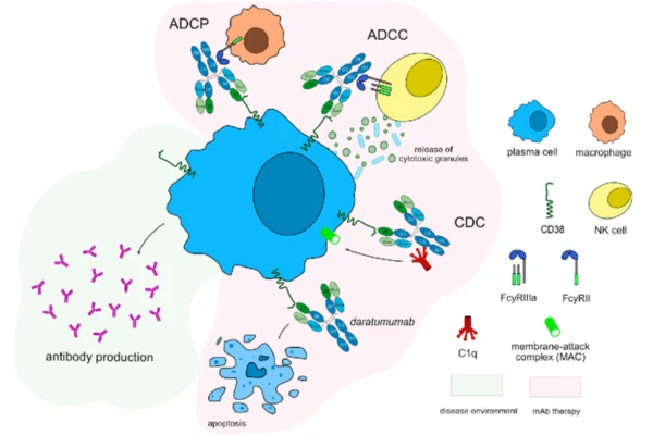 La proteína CD38 es una glicoproteína transmembrana que se expresa de forma abundante en la superficie de las células plasmáticas cancerosas (como las del mieloma múltiple) y en las células involucradas en la amiloidosis de cadena ligera primaria, mientras que su expresión en células sanas es mínima.