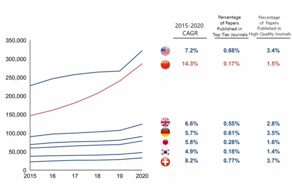 Entre 2015 y 2020, el número de artículos publicados por China en el campo de la biomedicina creció a una tasa compuesta anual promedio del 14,3%, alcanzando casi 290.000 publicaciones en 2020.