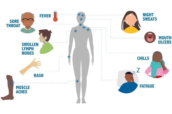 En la fase aguda, que ocurre entre 2 y 4 semanas después de la infección, los pacientes pueden presentar síntomas similares a la gripe, como fiebre, fatiga, dolores musculares, dolores de cabeza, faringoamigdalitis y erupciones cutáneas.