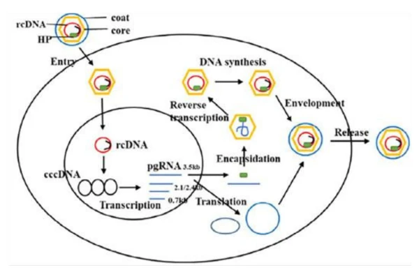 El HBV es un virus de DNA hepatotrópico que invade las células hepáticas y se replica durante un tiempo prolongado, lo que provoca inflamación hepática repetida y la destrucción gradual del tejido hepático normal.