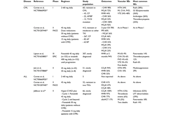 Los resultados mostraron que en los pacientes con leucemia con mutación T315I, la tasa de respuesta hematológica completa (RHC) fue del 57%, y la tasa de respuesta citogenética completa (RCC) alcanzó el 40%, con una mediana de supervivencia global de 15,6 meses, lo que representa una mejora significativa en comparación con los tratamientos disponibles en ese momento.