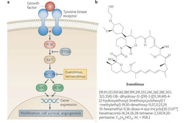 El mTOR, como una quinasa reguladora clave reguladora clave en el crecimiento, diferenciación y metabolismo celular, presenta una regulación anormal al alza en múltiples tumores, y el everolimus, al inhibir precisamente este objetivo, se ha convertido en un medicamento central en el campo del tratamiento de tumores.